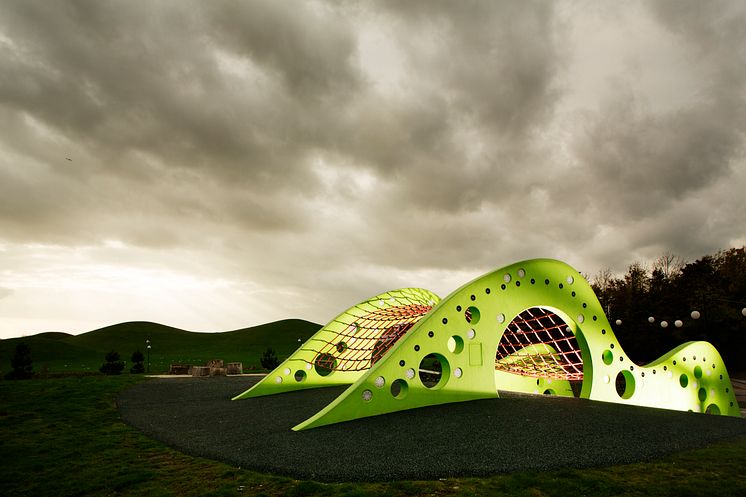 Den gigantiska rutschkanan Drakryggen består av grönmålad betong med ingjuten belysning. För många är betong inte det naturliga valet för en lekplats, men här har S:t Eriks visat på materialets lekfullhet. Dessutom är det hållbart, det går varken att elda upp, flytta eller förstöra, något som annars kan vara ett problem i offentliga miljöer.