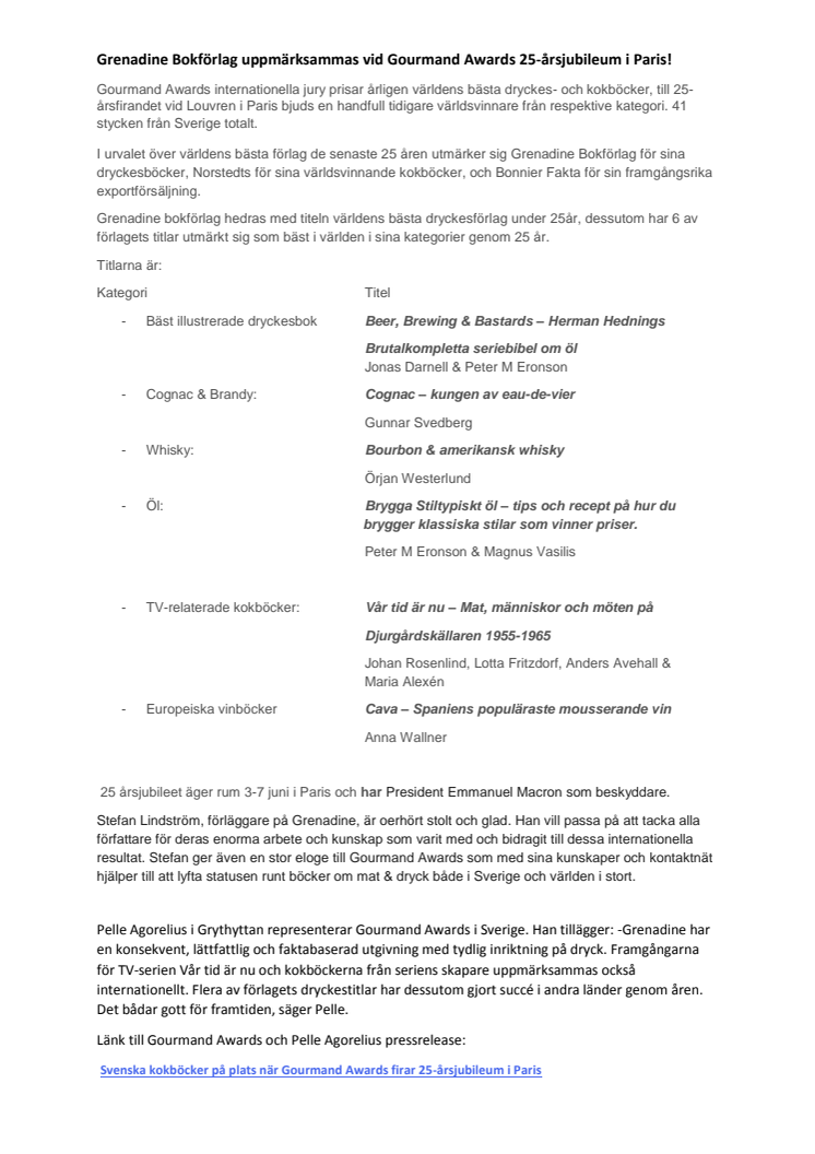 Grenadine Bokförlag uppmärksammas vid Gourmand Awards 25-årsjubileum i Paris!