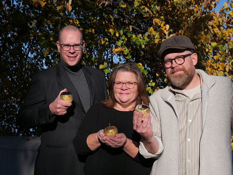 Årets Guldäpplepristagare: Anders Enström, förstelärare i digitalisering, på Lärande Grundskola Skapa i Huddinge, Pernilla Andersson, lärare på ekonomiprogrammet, Eksjö gymnasium och Martin Howe, förstelärare, mellanstadielärare på Paradisskolan och utvecklare Borlänge kommuns skolor. Foto: Bo Helmersson