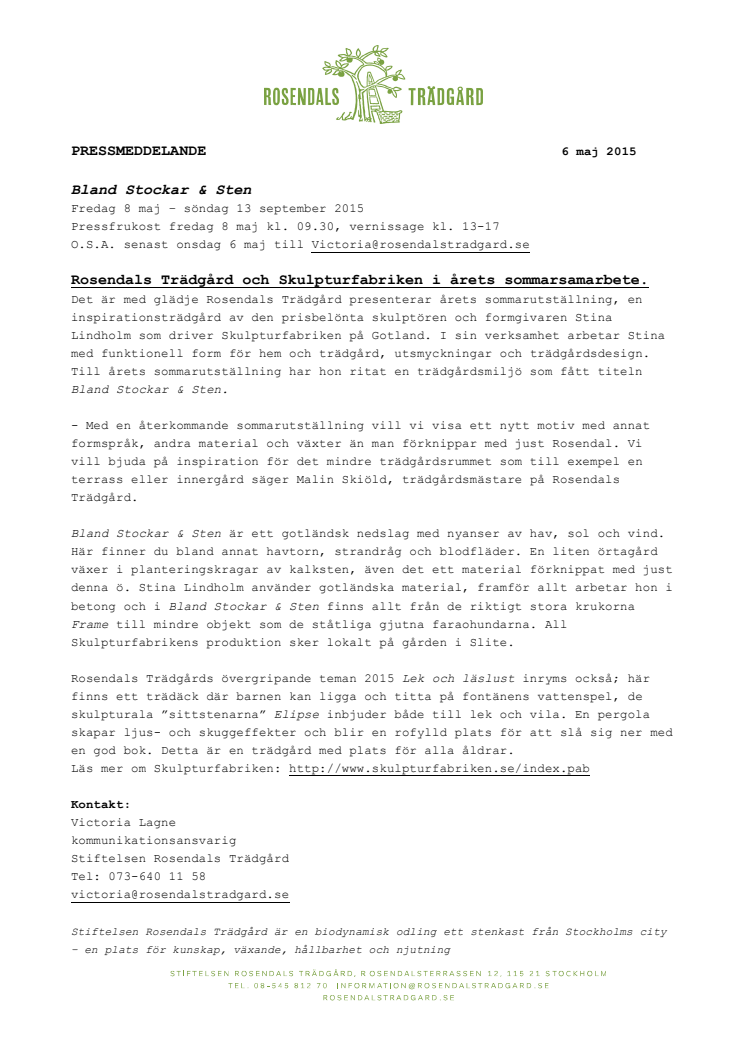 Årets sommarutställning på Rosendals Trädgård blir ett gotländskt gästspel då den prisbelönta skulptören och formgivaren Stina Lindholm ritat en inspirationsträdgård. Hon driver Skulpturfabriken och arbetar med funktionell form för hem och trädgård, utsmyckningar i både privat och offentlig miljö samt är en formstark trädgårdsdesigner. Ända till september finns utställningen att se.