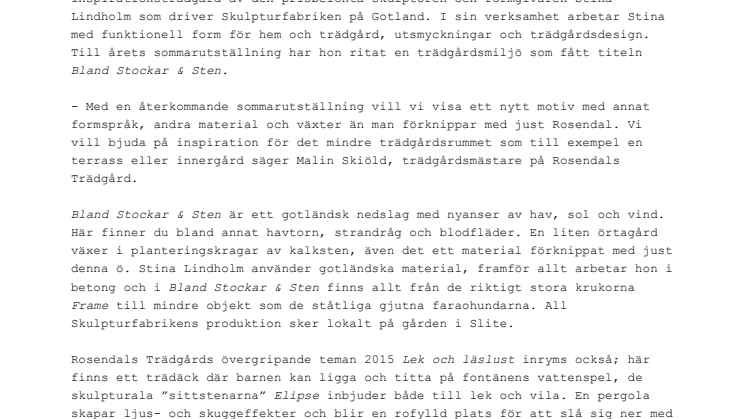 Det är med glädje Rosendals Trädgård presenterar årets sommarutställning, en inspirationsträdgård av den prisbelönta skulptören och formgivaren Stina Lindholm som driver Skulpturfabriken på Gotland. I sin verksamhet arbetar Stina med funktionell form för hem och trädgård, utsmyckningar och trädgårdsdesign.