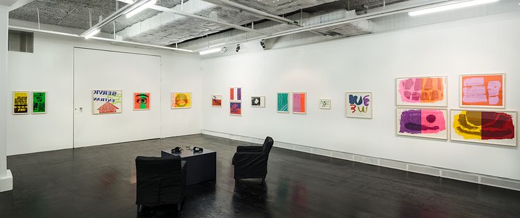 I bakgrunden ses verk av Sister Corita Kent
