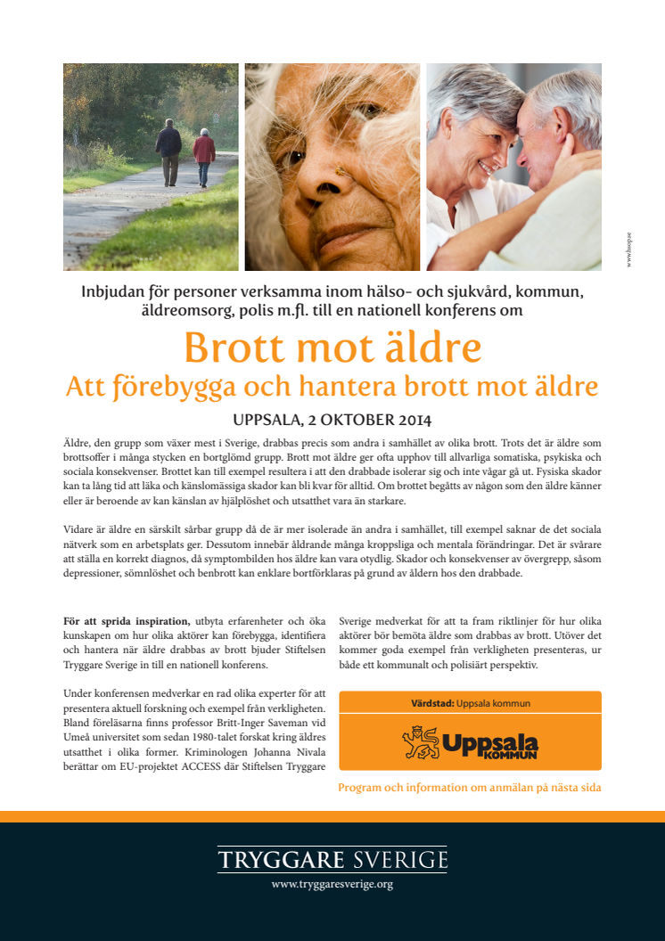 Nu har Stiftelsen Tryggare Sverige utarbetat en ny modell för att göra risk- och sårbarhetsanalyser vad gäller kommunernas arbete med äldres utsatthet för brott. Modellen presenteras vid en nationell konferens om äldres utsatthet för brott som Stiftelsen Tryggare Sverige arrangerar tillsammans med Uppsala kommun den 2 oktober 2014 (fortfarande finns ett fåtal platser kvar).