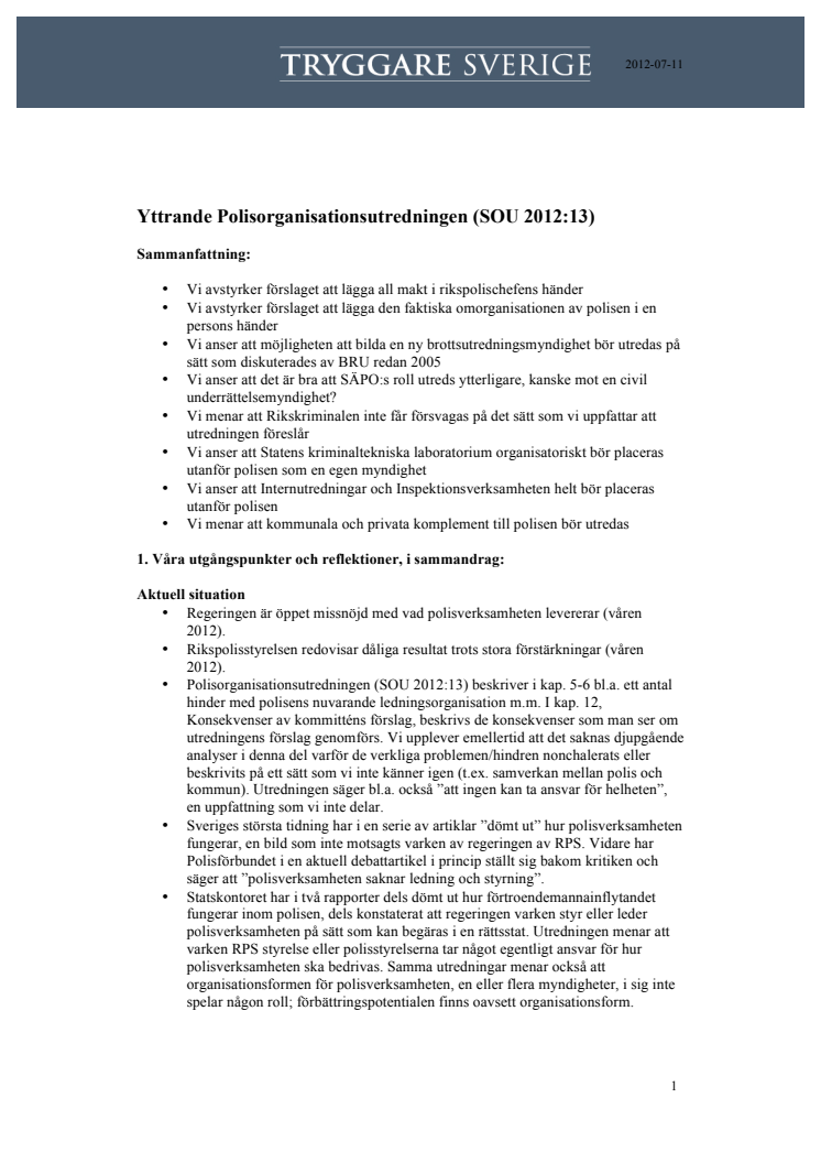 Redan i vårt remissvar på Polisorganisationskommitténs förslag (SOU 2012:13) i juli 2012 beskrev vi de risker som finns med att flytta ut den polisiära metodutvecklingen i landet (se s. 13 ff).