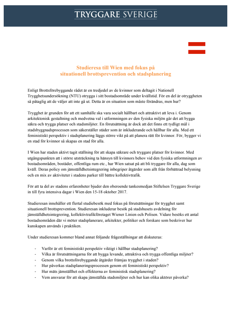 Stiftelsen Tryggare Sverige bjuder in till en studieresa till Wien den 15-18 oktober, med fokus på feministisk stadsplanering i den offentliga miljön.