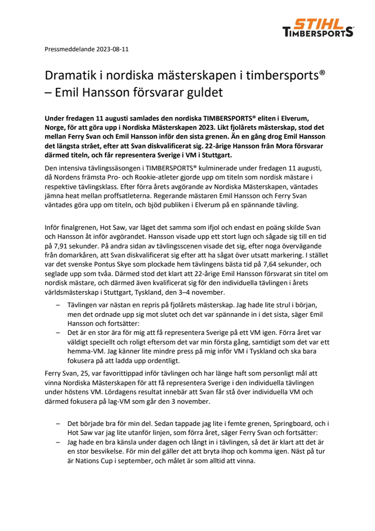 Under fredagen 11 augusti samlades den nordiska TIMBERSPORTS® eliten i Elverum, Norge, för att göra upp i Nordiska Mästerskapen 2023. Likt fjolårets mästerskap, stod det mellan Ferry Svan och Emil Hansson inför den sista grenen. Än en gång drog Emil Hansson det längsta strået, efter att Svan diskvalificerat sig. 22-årige Hansson från Mora försvarar därmed titeln, och får representera Sverige i VM i Stuttgart.