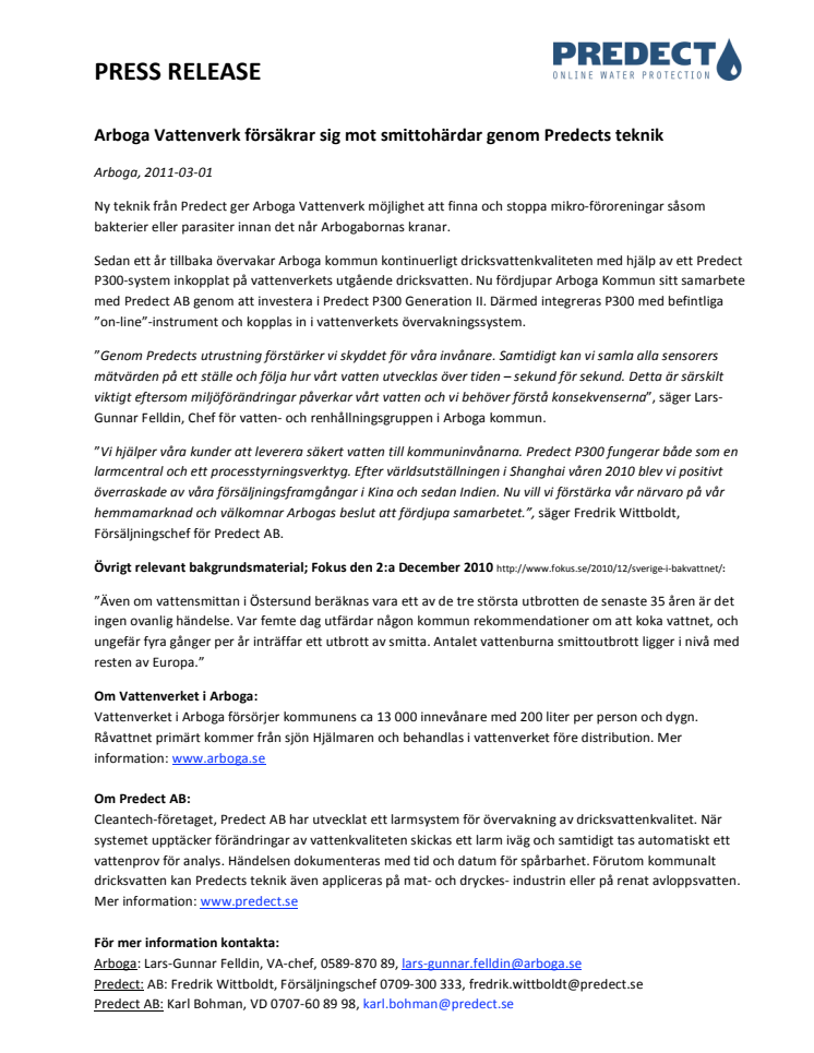 Ny teknik från Predect ger Arboga Vattenverk möjlighet att finna och stoppa mikroföroreningar såsom bakterier eller parasiter innan det når Arbogabornas kranar.