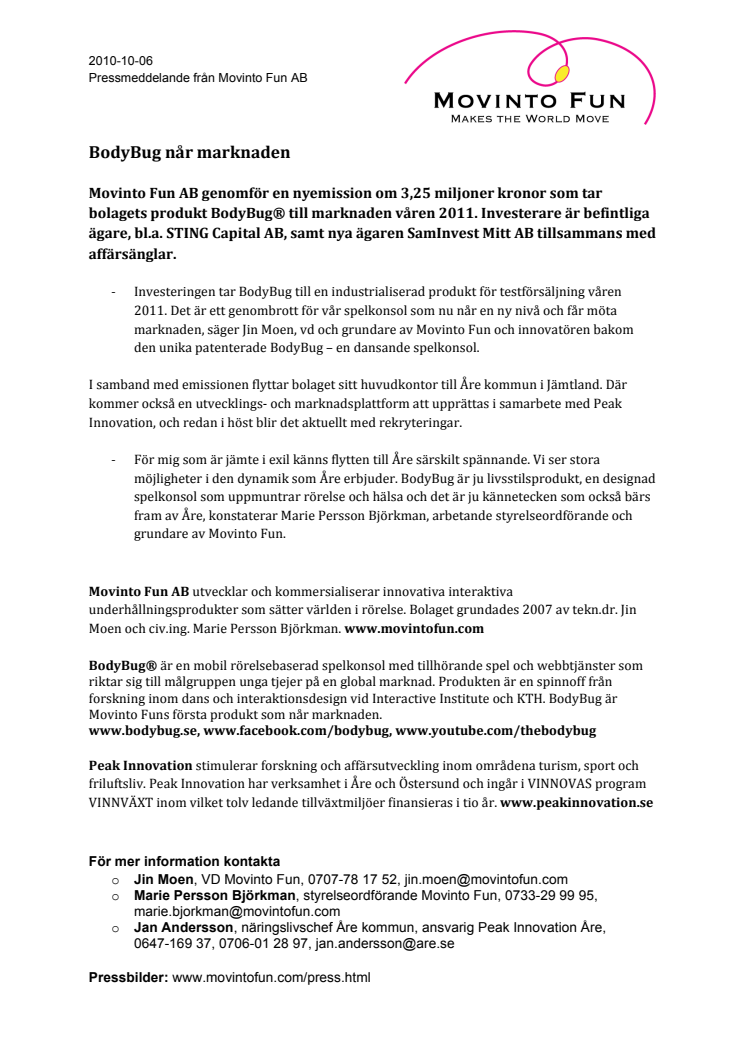 Movinto Fun AB genomför en nyemission om 3,25 miljoner kronor som tar bolagets produkt BodyBug® till marknaden våren 2011. Investerare är befintliga ägare, bl.a. STING Capital AB, samt nya ägaren SamInvest Mitt AB tillsammans med affärsänglar.