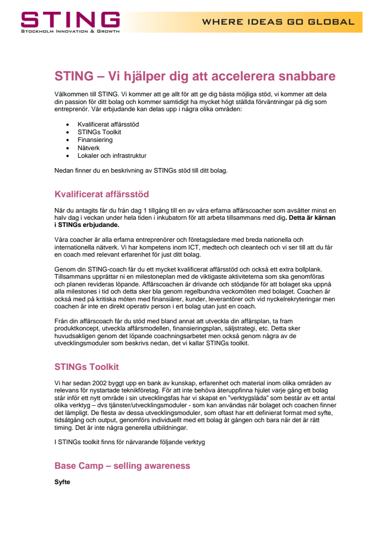 Här beskriver vi mycket detaljerat hur affärsinkubatorn STING hjälper nystartade innovativa bolag att växa.