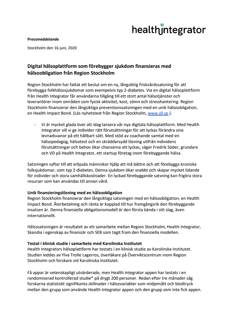 Region Stockholm har fattat ett beslut om en ny, långsiktig friskvårdssatsning för att förebygga folkhälsosjukdomar som exempelvis typ 2-diabetes. Via en digital hälsoplattform får användarna tillgång till hälsotjänster och leverantörer inom områden som fysisk aktivitet, kost, sömn och stresshantering. Region Stockholm finansierar satsningen med en unik hälsoobligation, en Health Impact Bond.