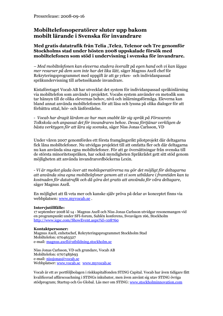 Med gratis datatrafik från Telia ,Tele2, Telenor och Tre genomför Stockholms stad under hösten 2008 uppskalade försök med mobiltelefonen som stöd i undervisning i svenska för invandrare.