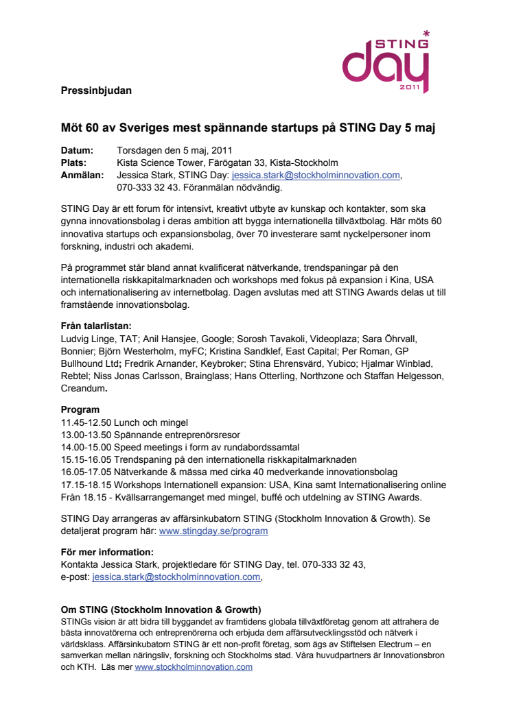 STING Day är ett forum för intensivt, kreativt utbyte av kunskap och kontakter, som ska gynna innovationsbolag i deras ambition att bygga internationella tillväxtbolag. Här möts 60 innovativa startups och expansionsbolag, över 70 investerare samt nyckelpersoner inom forskning, industri och akademi. STING Day 2011 arrangeras torsdagen den 5 maj i Kista Science City.