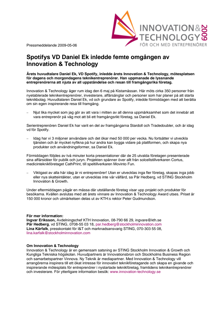 Årets huvudtalare Daniel Ek, VD Spotify, inledde årets Innovation & Technology, mötesplatsen för dagens och morgondagens teknikentreprenörer. Han uppmanade de lyssnande entreprenörerna att njuta av all uppståndelse och resan till framgångsrika företag.