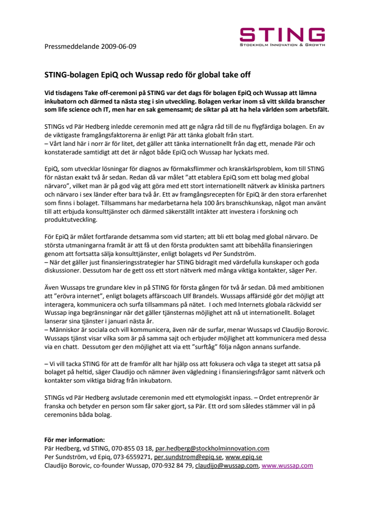 Vid tisdagens Take off-ceremoni på STING var det dags för bolagen EpiQ och Wussap att lämna inkubatorn och därmed ta nästa steg i sin utveckling. Bolagen verkar inom så vitt skilda branscher som life science och IT, men har en sak gemensamt; de siktar på att ha hela världen som arbetsfält.