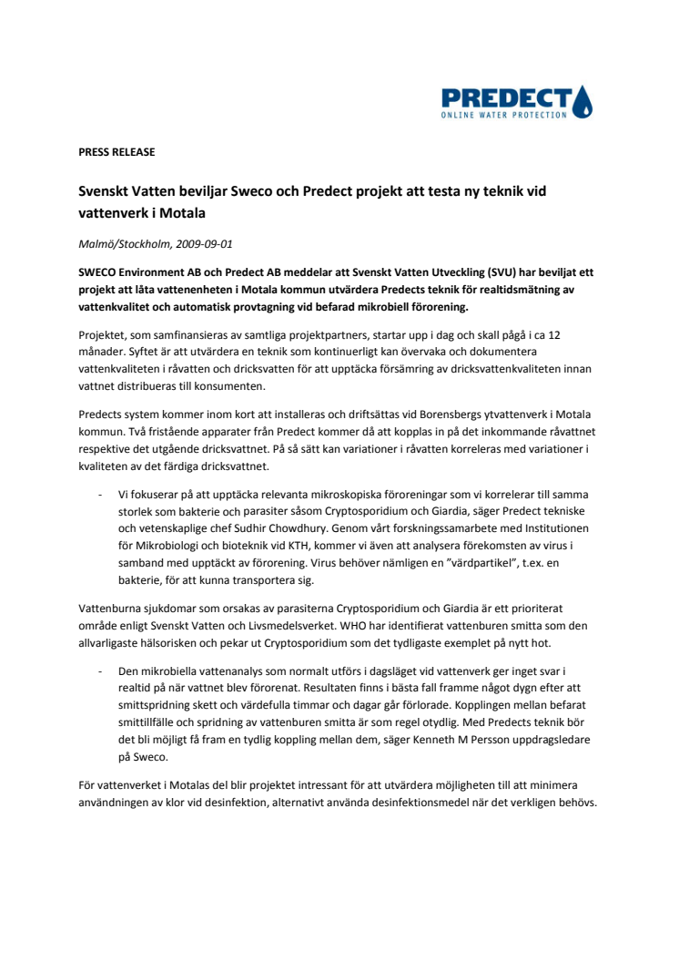 SWECO Environment AB och Predect AB meddelar att Svenskt Vatten Utveckling (SVU) har beviljat ett projekt att låta vattenenheten i Motala kommun utvärdera Predects teknik för realtidsmätning av vattenkvalitet och automatisk provtagning vid befarad mikrobiell förorening.