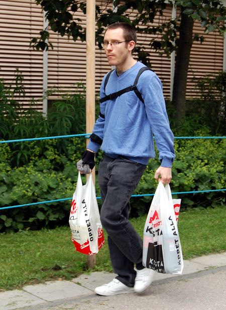 Mathias Eriksson skadade sin underarm svårt i en olycka i tonåren då han lutade sig mot ett fönster som gick sönder. Som följd av det har han permanenta skador i musklerna och senorna i underarmen, och bara ca 75 procent av kraften kvar i handens grepp. Med svenska Bioservos robothandske, SEM Glove, kan Mathias och andra personer med svag handstyrka få ny kraft i händerna.