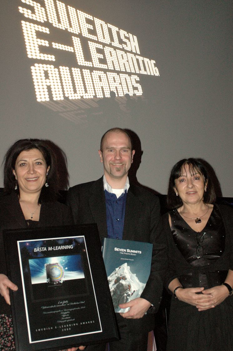 Swedish E-learning Award i klassen Bästa m-Learning (e-Learning med mobila enheter) har tilldelats Stockholms stads utbildningsenhet Rekryteringsprogrammet och leverantören Vocab AB. Vocabs VD, Niss Jonas Carlsson, syns här tillsammans med Saniye Akdag (t v) och Gülderen Sagatay från Stockholms stads utbildningsenhet .
