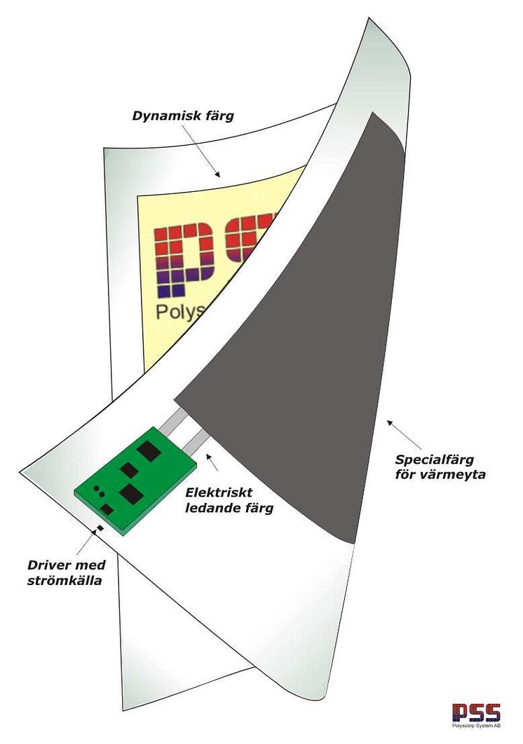 Polyscorp System AB (PSS) har utvecklat en unik, patenterad teknik för att ta fram tryckta, rörliga och färgföränderliga bildytor på papper. Företagets system innefattar ett special utvecklat användargränssnitt, egen drivelektronik och programvara, samt tryck med funktionella tryckfärger och pappersburna tryckbärare.