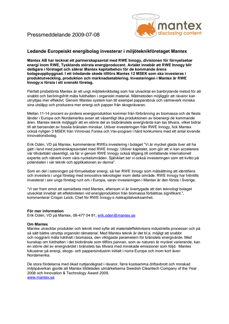Mantex AB har tecknat ett partnerskapsavtal med RWE Innogy, divisionen för förnyelsebar energi inom RWE, Tysklands största energiproducent. Avtalet innebär att RWE Innogy blir delägare i företaget och säkrar Mantex kapitalbehov för de kommande årens bolagsuppbyggnad. I ett inledande skede tillförs Mantex 12 MSEK som ska investeras i produktutveckling, produktion och marknadsetablering. Investeringen i Mantex är RWE Innogy:s första i ett svenskt företag.