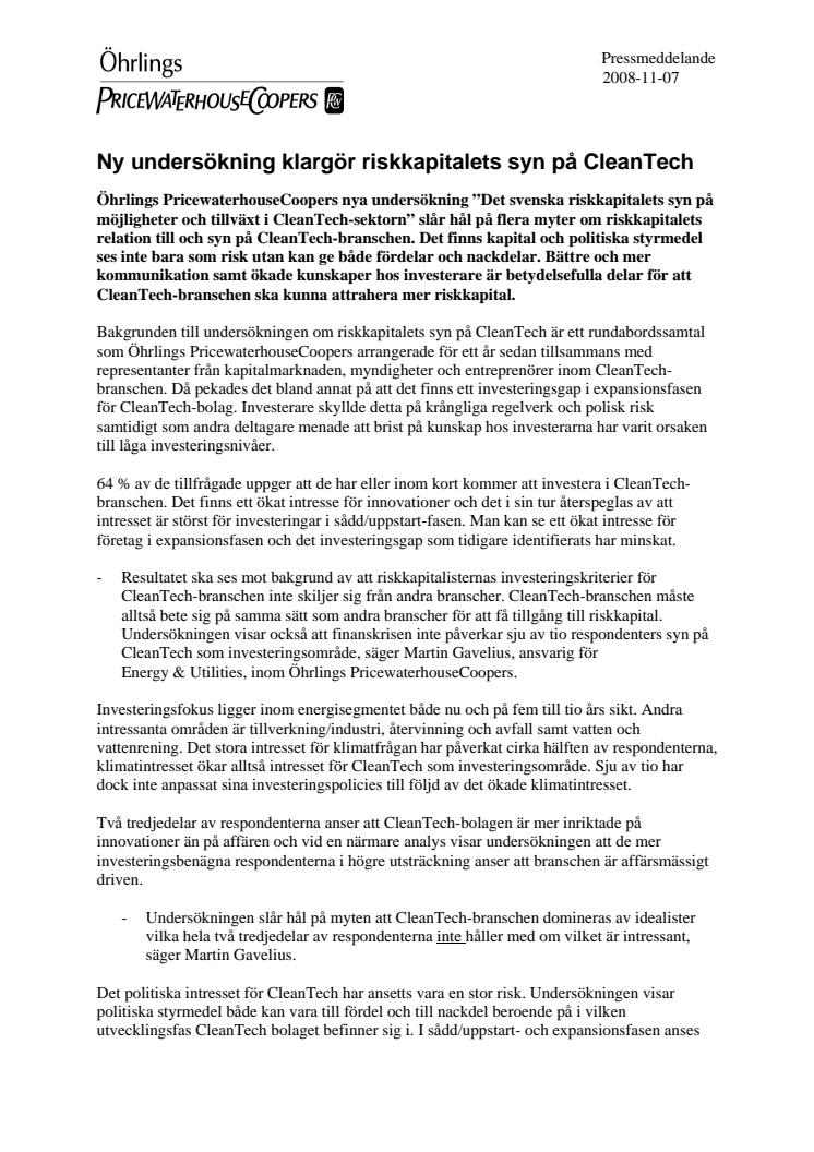 Under eventet presenterade även Martin Gavelius, Director Öhrling PricewaterhouseCoopers, en ny rapport om det svenska riskkapitalets syn på Cleantech. Rapporten visade bland annat att den nuvarande finanskrisen inte påverkar cleantechområdet nämnvärt och att merparten av de tillfrågade (64 procent) redan har, eller kommer inom kort att investera i branschen.