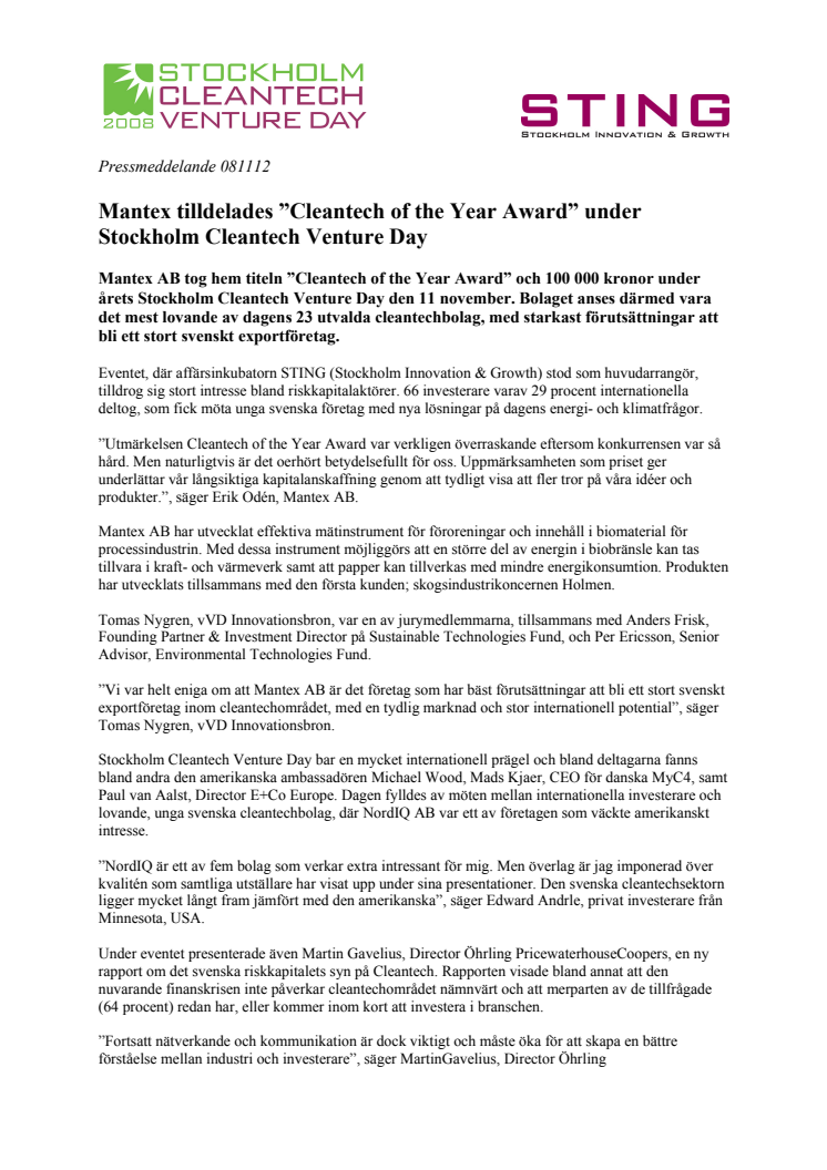 Mantex AB tog hem titeln "Cleantech of the Year Award" och 100 000 kronor under årets Stockholm Cleantech Venture Day den 11 november. Bolaget anses därmed vara det mest lovande av dagens 23 utvalda cleantechbolag, med starkast förutsättningar att bli ett stort svenskt exportföretag.
