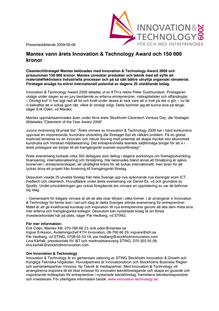Cleantechföretaget Mantex belönades med Innovation & Technology Award 2009 och prissumman 150 000 kronor. Mantex utvecklar produkter och teknik med att syfte att materialeffektivisera industriella processer och på så sätt bättre utnyttja organiskt råmaterial. Företaget ansågs ha störst internationell potential av dagens 25 utställande bolag.