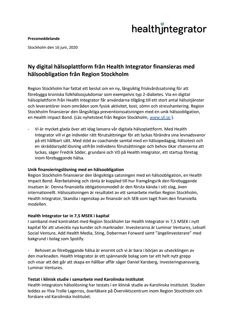 I samband med kontraktet med Region Stockholm tar Health Integrator in 7,5 MSEK i nytt kapital för att utveckla nya kunder och marknader. Investerarna är Luminar Venture, Leksell Social Venture, Add Health Media, Sting, Doberman Forward samt ängelinvesterare med bakgrund i bolag som Spotify.