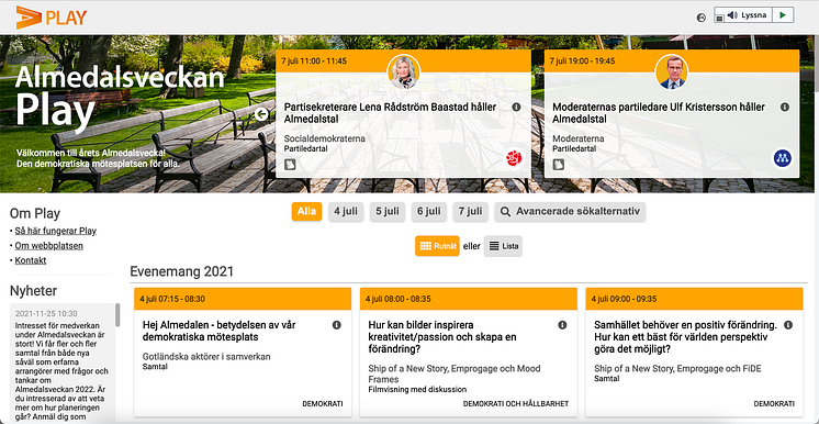 På den digitala plattformen presenteras alla evenemang som har en digital sändning under Almedalsveckan. Det är därför viktigt att det är en enkel upplevelse för arrangörer att lägga in och skapa evenemang. Samtidigt ska Play både vara enkel att navigera, grafiskt spegla Almedalen och vara tillgänglig för besökarna.
