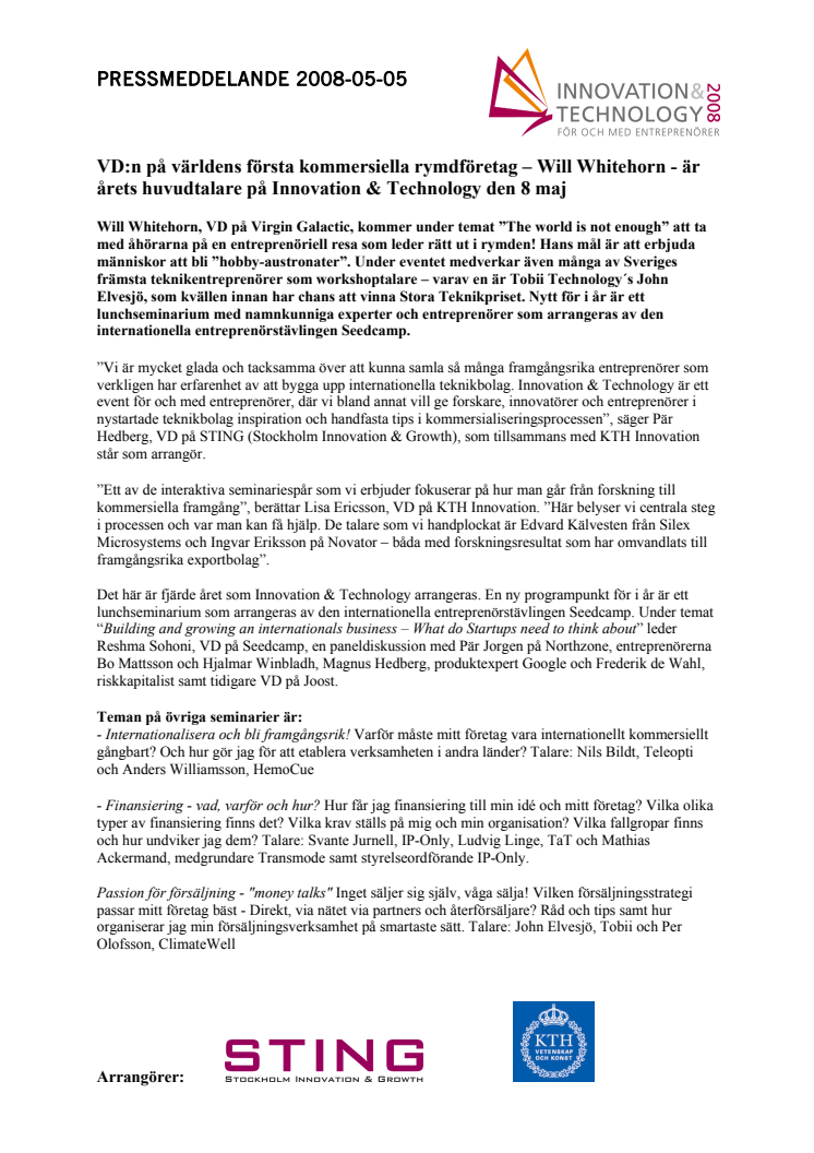 ”Vi är mycket glada och tacksamma över att kunna samla så många framgångsrika entreprenörer som verkligen har erfarenhet av att bygga upp internationella teknikbolag. Innovation & Technology är ett event för och med entreprenörer, där vi bland annat vill ge forskare, innovatörer och entreprenörer i nystartade teknikbolag inspiration och handfasta tips i kommersialiseringsprocessen”, säger Pär Hedberg, VD på STING (Stockholm Innovation & Growth), som tillsammans med KTH Innovation står som arrangör.
