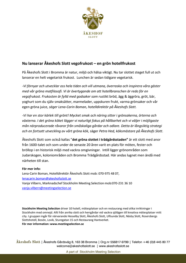 På Åkeshofs Slott i Bromma är natur, miljö och hälsa viktigt. Nu tar slottet steget full ut och lanserar en helt vegetarisk frukost. Lunchen är sedan tidigare vegetarisk.