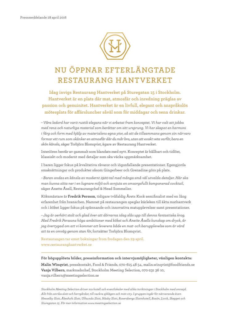 Idag invigs Restaurang Hantverket på Sturegatan 15 i Stockholm. Hantverket är en plats där mat, atmosfär och inredning präglas av passion och genuinitet. Hantverket är en livfull, elegant och anspråkslös mötesplats för affärsluncher såväl som för middagar och sena drinkar.