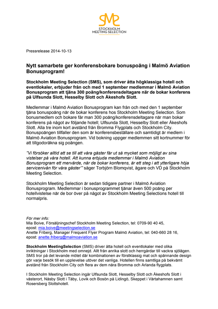 Stockholm Meeting Selection (SMS), som driver åtta högklassiga hotell och eventlokaler, erbjuder från och med 1 september medlemmar i Malmö Aviation Bonusprogram att tjäna 300 poäng/konferensdeltagare när de bokar konferens på Ulfsunda Slott, Hesselby Slott och Åkeshofs Slott.
