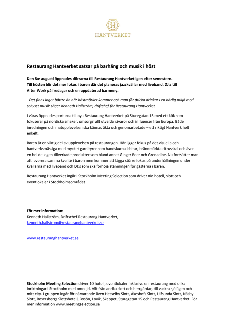 Den 8:e augusti öppnades dörrarna till Restaurang Hantverket igen efter semestern. Till hösten blir det mer fokus i baren där det planeras jazzkvällar med liveband, DJ:s till After Work på fredagar och en uppdaterad barmeny.