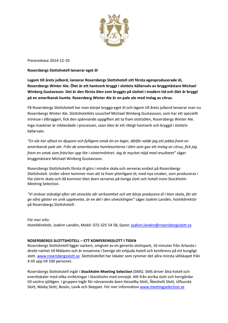Lagom till årets julbord, lanserar Rosersbergs Slottshotell sitt första egenproducerade öl, Rosersbergs Winter Ale. Ölet är ett hantverk bryggt i slottets källarvalv av bryggmästare Michael Winberg Gustavsson. Det är den första ölen som bryggts på slottet i modern tid och ölet är bryggt på en amerikansk humle. Rosersberg Winter Ale är en pale ale med inslag av citrus.