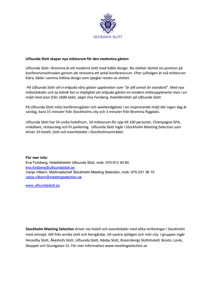 Ulfsunda Slott i Bromma är ett modernt slott med tidlös design. Nu stärker slottet sin position på konferensmarknaden genom att renovera ett antal konferensrum. Efter julhelgen är två mötesrum klara, båda i samma tidlösa design som speglar resten av slottet.