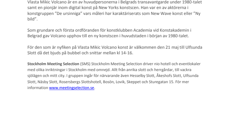 För den som är nyfiken på Vlasta Mikic Volcano konst är välkommen den 21 maj till Ulfsunda Slott då det bjuds på bubbel och snittar mellan kl 14-16.