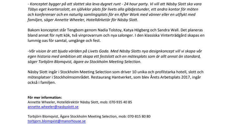 - Konceptet bygger på att slottet ska leva dygnet runt - 24 hour party. Vi vill att Näsby Slott ska vara Täbys eget kvartersslott, en självklar plats för livets alla glädjestunder, ett andra kontor för möten och konferenser och en naturlig samlingsplats för en After Work med vänner eller en utflykt med familjen, säger Annette Wheeler, Hotelldirketör för Näsby Slott.