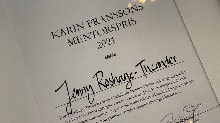 Jenny Roshage-Theander, restaurangchef på Näsby Slott har tilldelats Karin Franssons Mentorpris 2021 under morgonens prisutdelning på Restaurangakademien i Stockholm. År 2012 instiftade Årets Kock detta pris uppkallat efter Karin Fransson som syftar till att belöna mentorer som i sitt arbete och ledarskap bidragit till att lyfta och utveckla kvinnliga kockar.