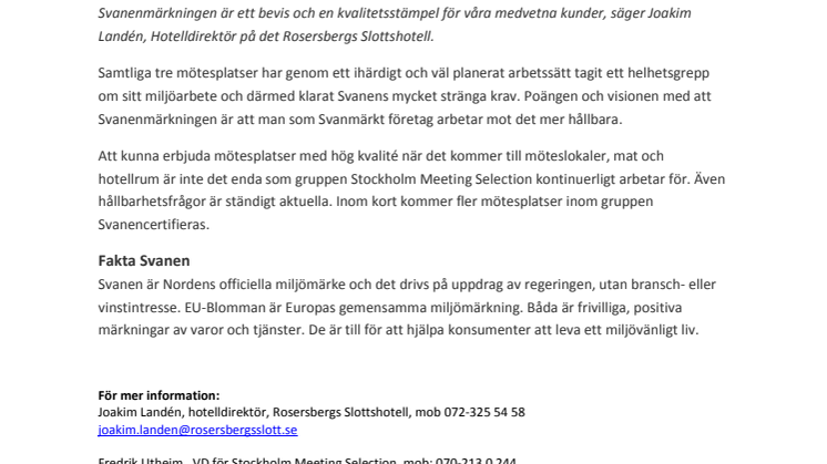 Inom Stockholm Meeting Selection är arbetet med miljö ständigt närvarande. Nu kan tre slott i gruppen titulera sig som Svanmärkta hotell-, restaurang-konferensverksamheter: Ulfsunda Slott, Hesselby Slott och Rosersbergs Slottshotell.