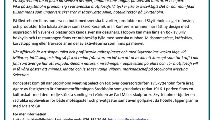 Lotta Ahlin, Hotelldirektör Skytteholm mob: 076-854 79 46, lotta.ahlin@skytteholm.se