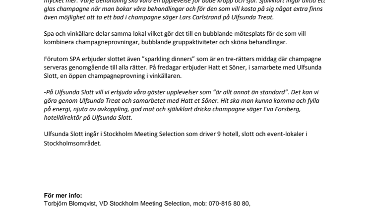 Genom samarbetet med det svenska champagnehuset, Hatt et Söner med eget show room i vinkällaren, har champagnen en viktig roll på Ulfsunda Slott. Nu utökas verksamheten med ett champagne Spa som är en del av Ulfsunda Treat.