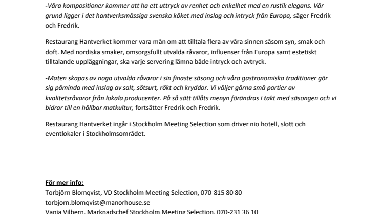 Restaurang Hantverket ingår i Stockholm Meeting Selection som driver nio hotell, slott och eventlokaler i Stockholmsområdet.