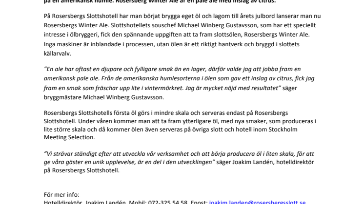 På Rosersbergs Slottshotell har man börjat brygga eget öl och lagom till årets julbord lanserar man nu Rosersbergs Winter Ale. Slottshotellets souschef Michael Winberg Gustavsson, som har ett speciellt intresse i ölbryggeri, fick den spännande uppgiften att ta fram slottsölen, Rosersbergs Winter Ale. Inga maskiner är inblandade i processen, utan ölen är ett riktigt hantverk och bryggd i slottets källarvalv.