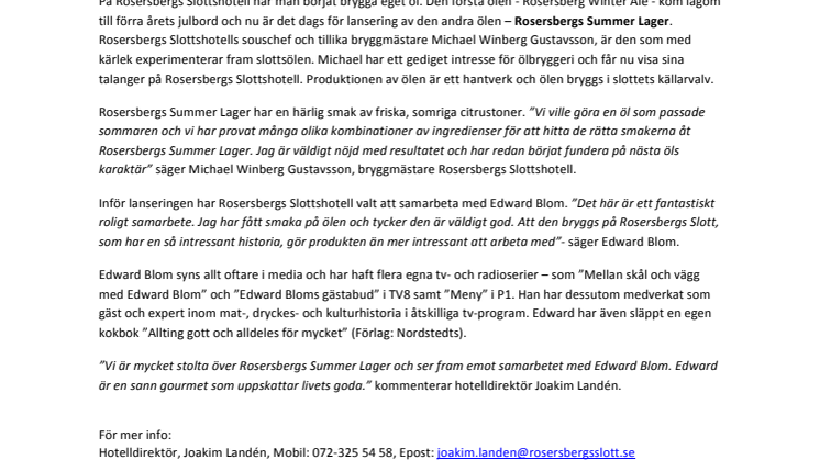 Rosersbergs Slottshotell lanserar nu sin andra öl - Rosersbergs Summer Lager - i samarbete med gastronom och kulturhistoriker Edward Blom. Ölen är ett riktigt hantverk bryggt i slottets källarvalv av bryggmästare Michael Winberg Gustavsson och har en frisk, somrig citruston i smaken.