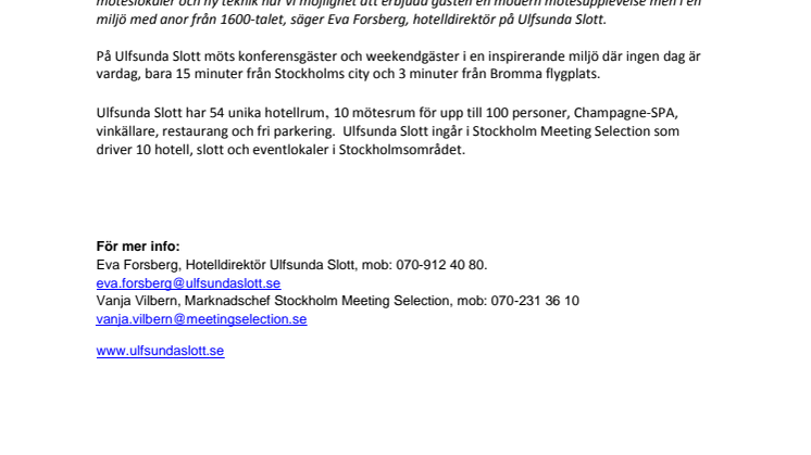 Eva Forsberg, Hotelldirektör Ulfsunda Slott, mob: 070-912 40 80 eva.forsberg@ulfsundaslott.se