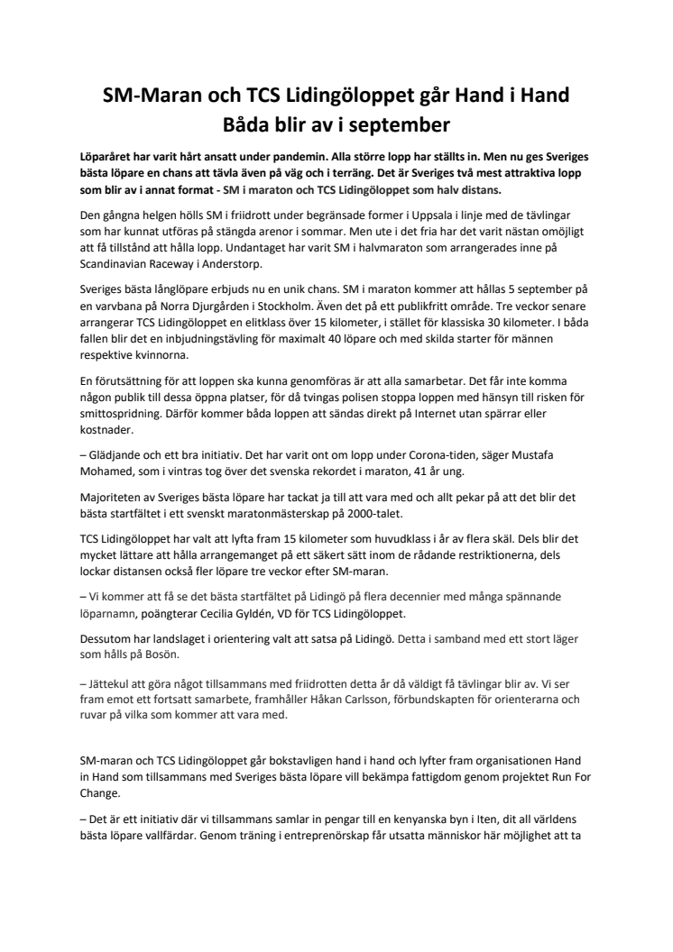SM-Maran och TCS Lidingöloppet går Hand i Hand. Båda blir av i september