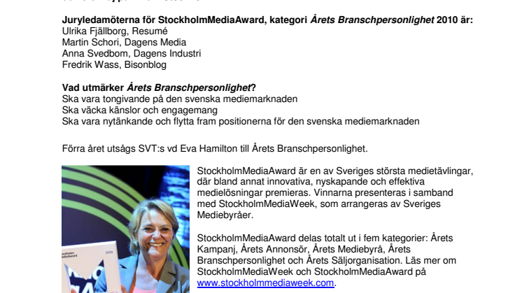 StockholmMediaAwards jurygrupp i kategorin Årets Branschpersonlighet 2010 är nu utsedd. Vinnaren koras under StockholmMediaWeek, mediebranschens årliga evenemang, den 5-6 maj på Rival i Stockholm.