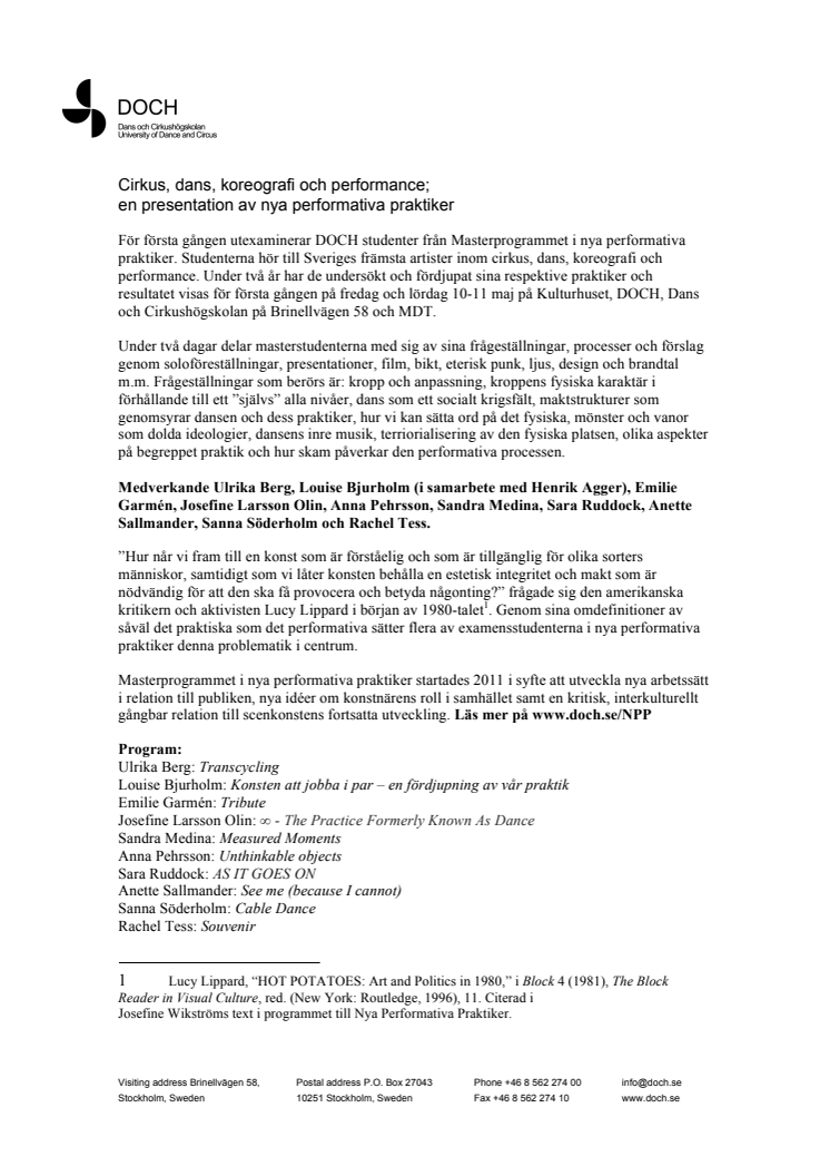 För första gången utexaminerar DOCH studenter från Masterprogrammet i nya performativa praktiker. Studenterna hör till Sveriges främsta artister inom cirkus, dans, koreografi och performance. Under två år har de undersökt och fördjupat sina respektive praktiker och resultatet visas för första gången 10-11 maj på Kulturhuset, DOCH, Dans och Cirkushögskolan på Brinellvägen 58 och MDT.