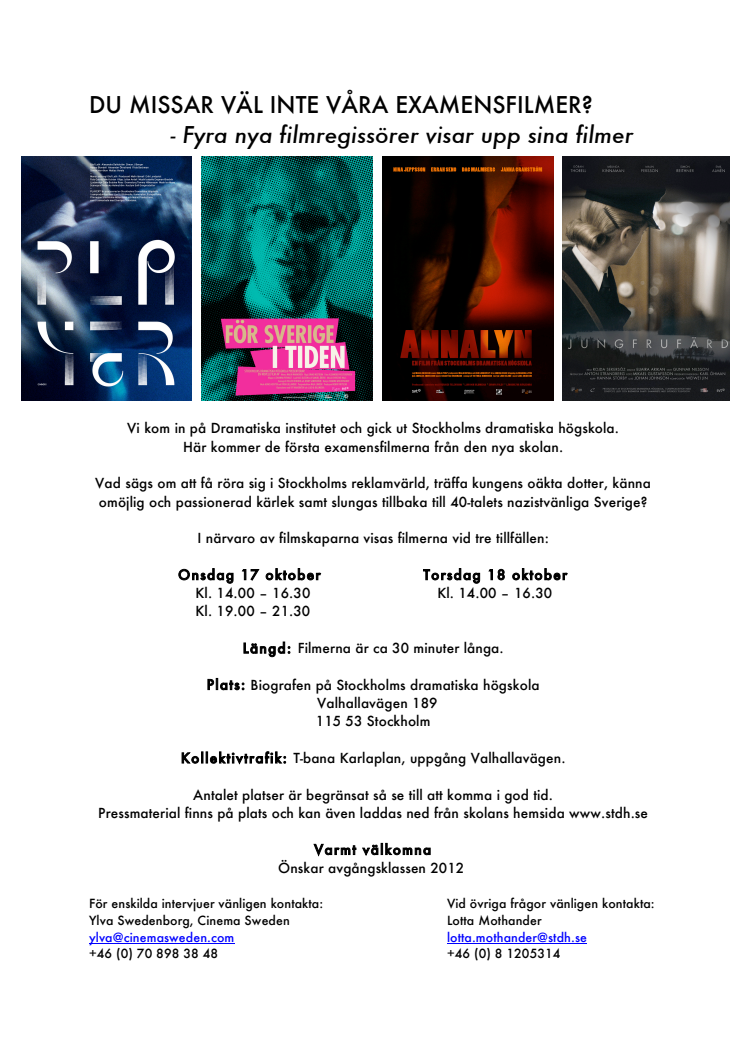 Bransch- & pressvisning av examensfilmer på StDH 17 & 18 oktober. Vad sägs om att få röra sig i Stockholms reklamvärld, träffa kungens oäkta dotter, känna omöjlig och passionerad kärlek samt slungas tillbaka till 40-talets nazistvänliga Sverige? Examensstudenterna kom in på Dramatiska institutet och gick ut från Stockholms dramatiska högskola. Här är de första examensfilmerna från nya skolan.