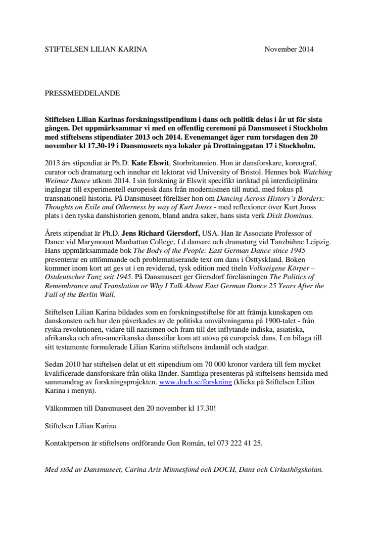 Stiftelsen Lilian Karinas forskningsstipendium i dans och politik delas i år ut för sista gången. Det uppmärksammar vi med en offentlig ceremoni på Dansmuseet i Stockholm med stiftelsens stipendiater 2013 och 2014. Evenemanget äger rum torsdagen den 20 november kl 17.30-19 i Dansmuseets nya lokaler på Drottninggatan 17 i Stockholm.